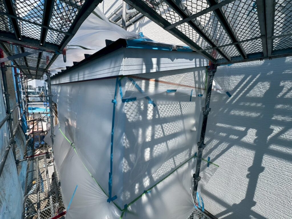 今回の施工では、破風と外壁・軒天の取り合い部分に対して、マスキングテープとビニールを使用し丁寧に養生を行いました。