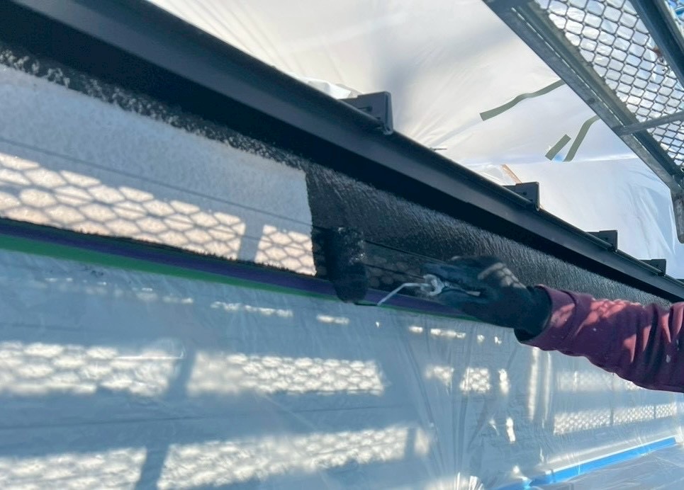 今回の施工では、下塗り後に破風部分の中塗り作業を行いました。